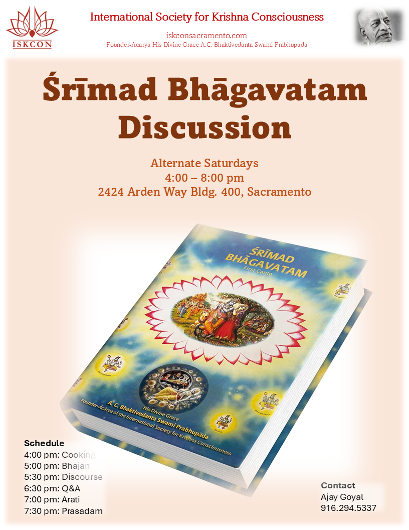 Saturday Evening Bhagavatam Class Join Us + Add to Google Calendar + iCal / Outlook export 00 days 00 hours 00 minutes 00 seconds Date May 02 2026 Time 4:00 am - 8:00 pm Location ISKCON Temple 2424 Arden Way, Bldg 400 #7, Sacramento, CA 95825 Category Weekly Events Share this event